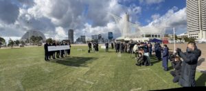 火曜日から木曜日にかけてメリケンパークの多目的広場に芝生を再び敷設。養生を施した上で本日(23日金曜日)に移設完了のセレモニーが関係各所の代表者様をお招きして執り行われました。