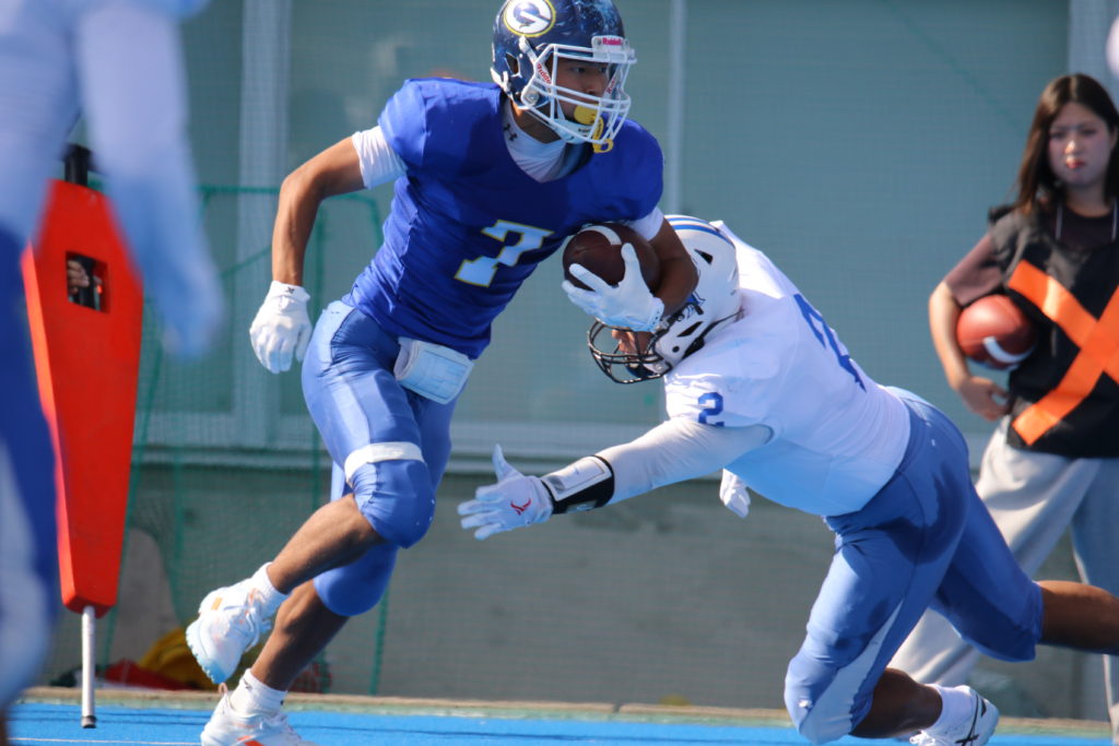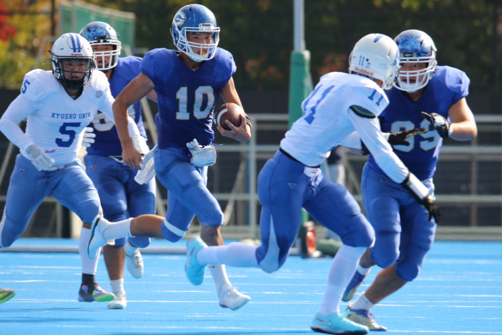 後半に入り最初の九州大学の攻撃シリーズでQB#3山縣肇(4年)からWR兒玉伊吹(4年)への44ヤードのパスが成功し敵陣ゴール前に攻め込むと、再び同じコンビネーションのパスでタッチダウンを決め同点とする。