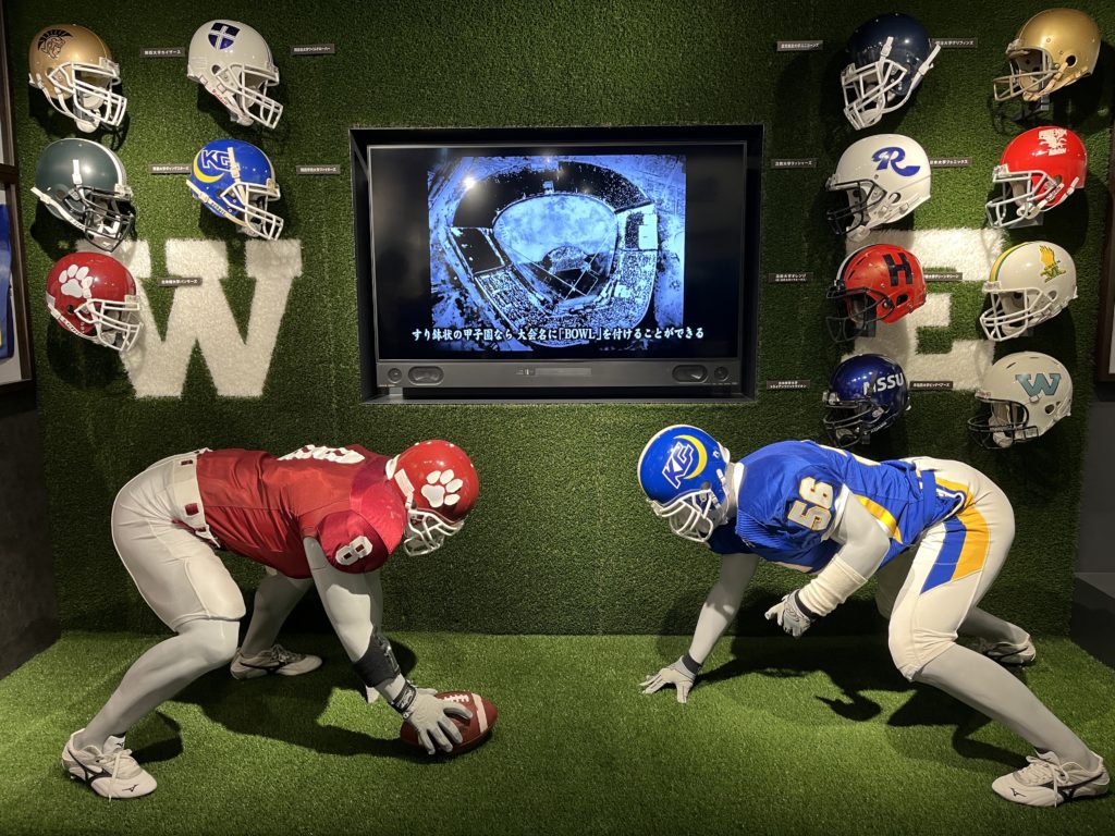 毎日甲子園ボウルコーナーでは、歴代出場校のヘルメットやユニホーム、写真パネル、過去の映像も放映しています。今年の対戦校ユニホームを着たマネキンが皆様をお出迎えいたします。